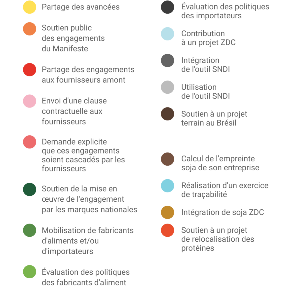 Les signataires sont encouragés à davantage communiquer leurs engagements, construire une politique et un plan d’action associé à ces engagements, mobiliser l’ensemble des acteurs de la chaîne de valeur et soutenir un import de soja garanti sans lien avec la déforestation et la conversion.
